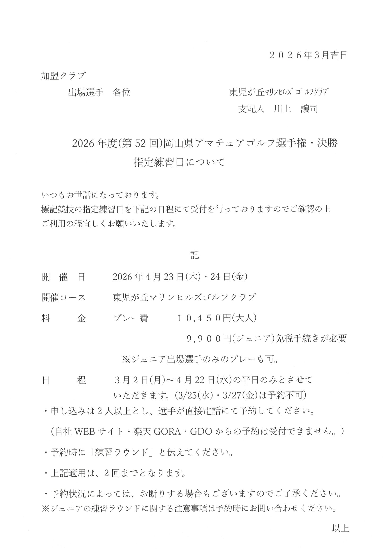 岡山県アマチュアゴルフ選手権・岡山県レディースゴルフ選手権出場選手の皆様へ